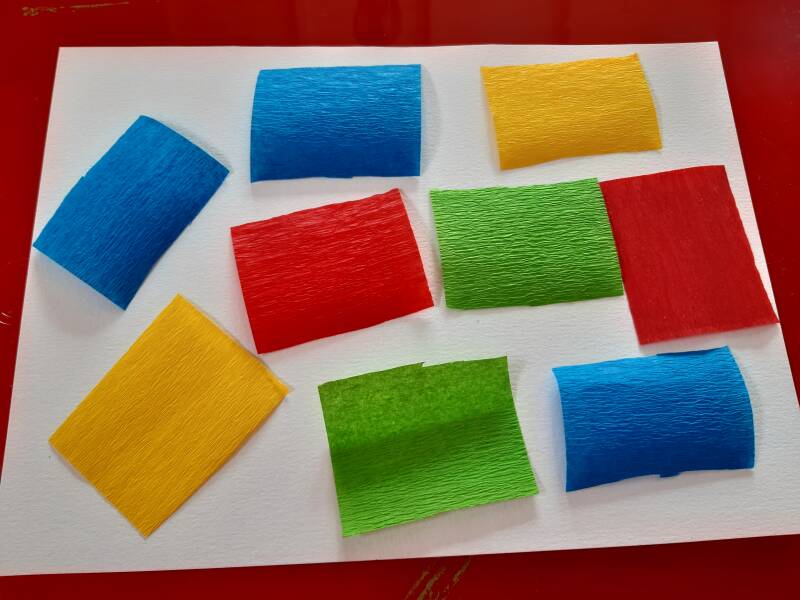 - Crêpepapier rood, oranje, geel, groen, blauw, paars