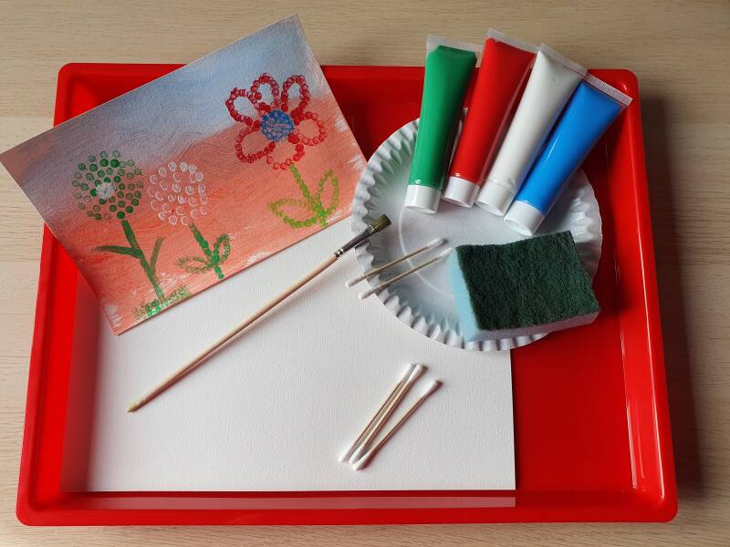 - Verven met schuurspons op aquarelpapier en bloemen stempelen met wattenstaafjes