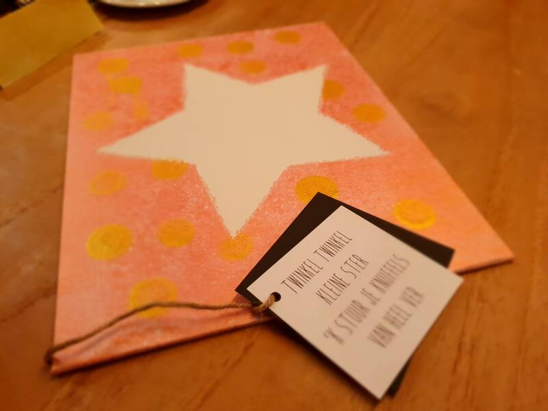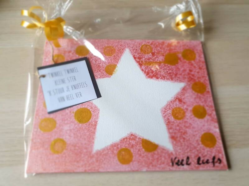 Verf de theelichthouders en het vaasje en plak er de zelfklevende sterretjes op. Pimp je placemat, servetring en naamkaartje met de gouden sterretjes, stempel met verf je canvas met ster en maak het gedichtje eraan vast.