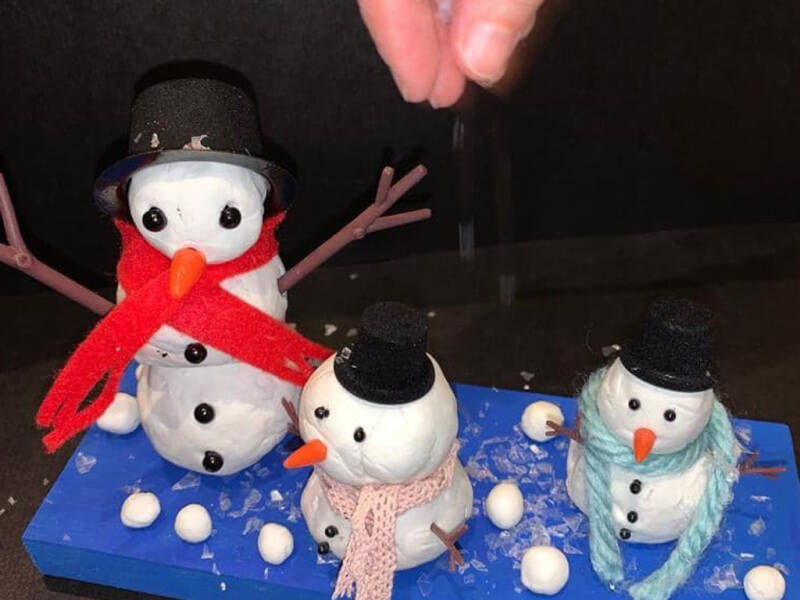 Verf het houten plankje, rol balletjes van klei en maak er sneeuwmannen van. Breng de oogjes, neus, armen, knoopjes, hoed en sjaal aan. Maak met de resterende klei sneeuwballetjes en voeg samen met de nepsneeuw toe aan het geheel.
